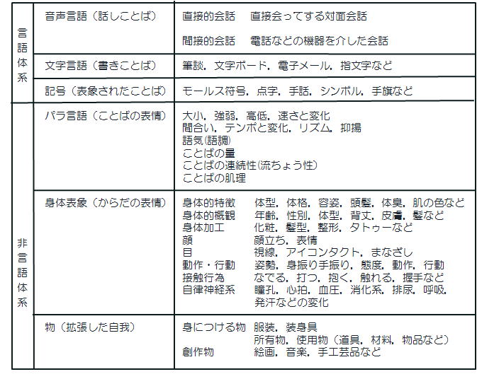 ![]() 意味記号としての言語以外のコミュニケーション(非言語コミュニケーション)は、「ことばの表情」「からだの表情」「物」などさまざまな要素が重なり、話し手の心のうちを言外に現しているもので、相互の五官(感覚受容器官)と感受される五感の生理的共通性を基盤に、類似体験や共有体験があって伝わる。 |